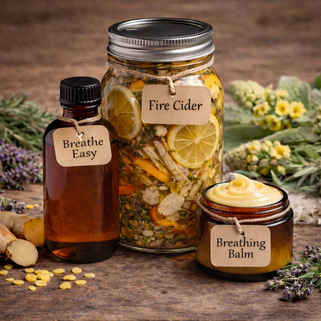 This bundle pairs internal and external herbal support in a simple, practical way. Fire Cider is traditionally used as a warming, immune-supportive tonic. Breathe Easy offers gentle herbal support for the respiratory system, while Breathing Balm is applied topically to the chest or back to encourage comfort and ease when breathing feels off.